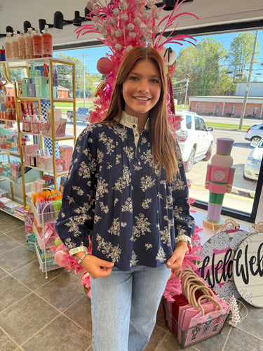 Blue and white floral blouse